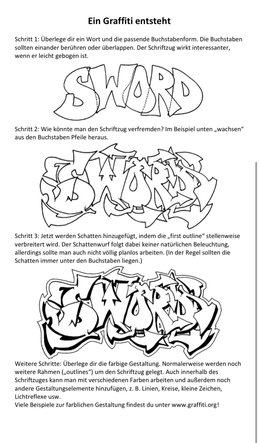 Nach eingehender Betrachtung verschiedener Graffiti haben wir gemeinsam die Kriterien für die Gestaltung eines ausdrucksstarken Pieces aufgestellt. Die Veränderung der Buchstaben nach den eigenen Vorstellungen ist eine eigene Kunst und somit eine Art der Typografie oder auch Kalligrafie. Beste Graffiti Ausmalbilder Graffiti Schrift Graffiti Buchstaben und coole Graffiti Bilder zum ausdrucken kostenlos.