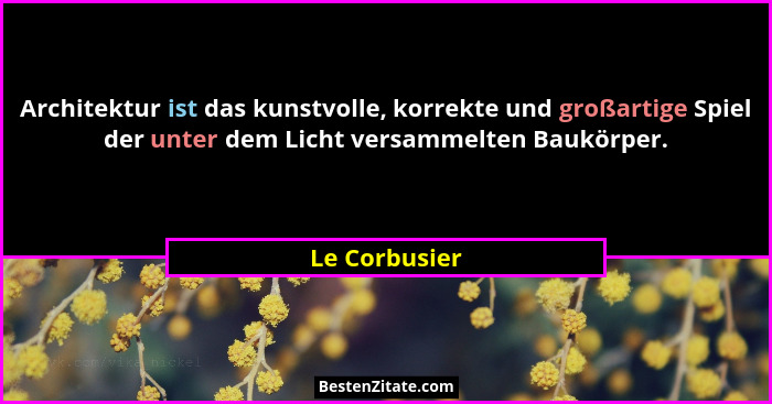 Architektur ist das kunstvolle korrekte und großartige Spiel der unter dem Licht versammelten. Architektur ist Harmonie und Einklang aller Teile die so erreicht wird dass nichts weggenommen zugefügt oder verändert werden könnte ohne das Ganze zu zerstören. Was stehenbleiben soll muß recht stehen und wo nicht für die Ewigkeit doch für geraume Zeit genügen.