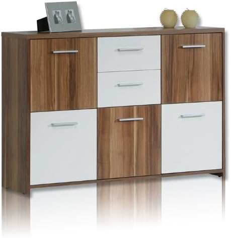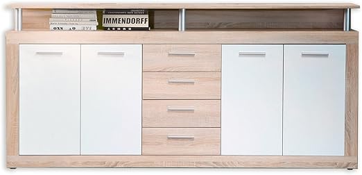 Der warme Holzfarbton wird durch die weißen Türen eindrucksvoll betont. 147 x 89 x 37 cm. Der optische Gesamteindruck wird durch das integrierte Aufsatzregal bestimmt was zum Dekorieren einlädt.