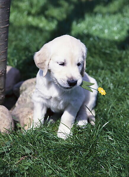 Bildagentur Mauritius Images Meadow Golden Retrievers Puppy Sit Garden Animal Animals Mammal Mammals Dog Young White Small Dogs Mouth Artificial Flower Canidae Young Animal Young Animals Dog Puppy Puppy Pet